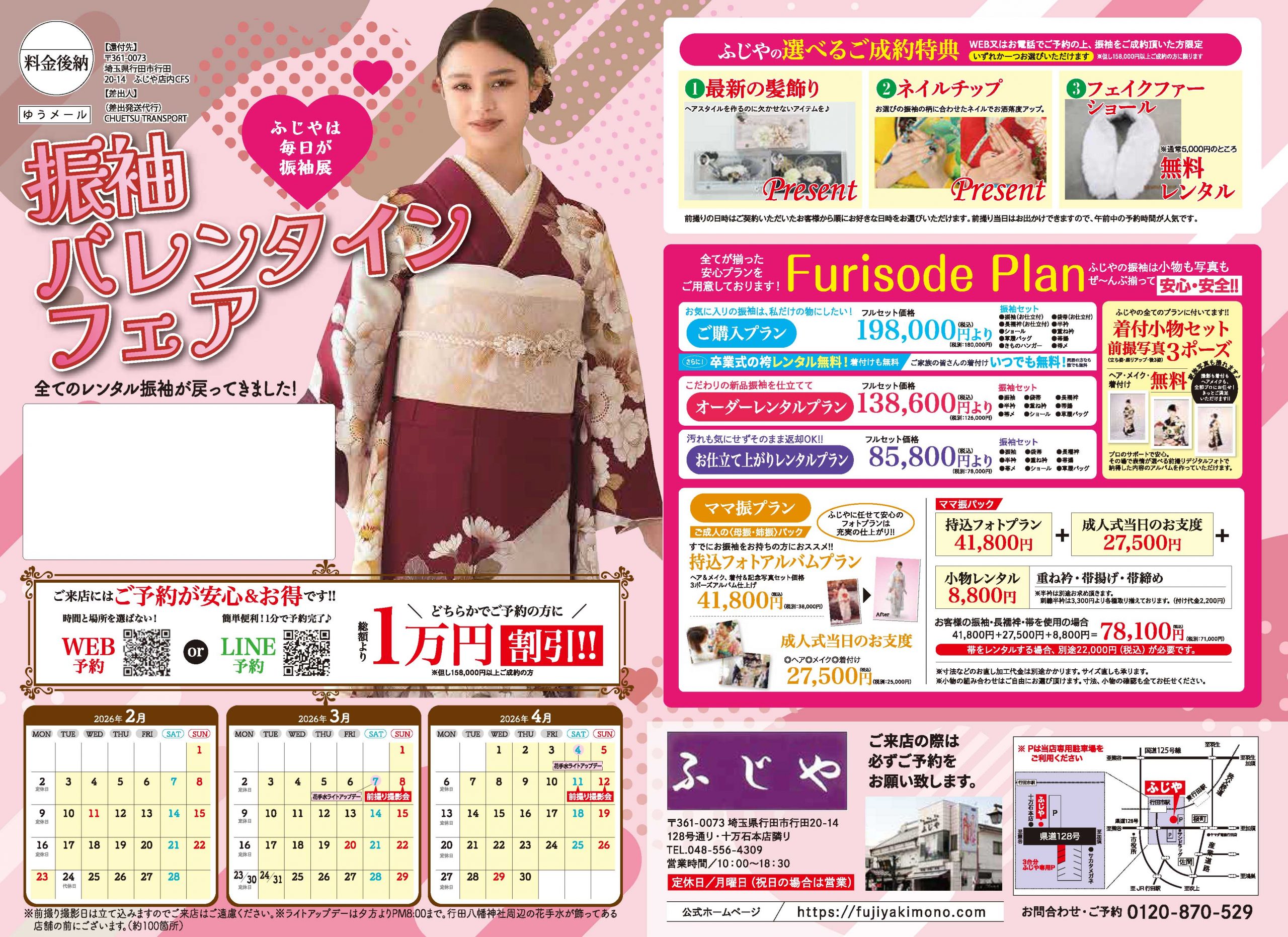 お陰様で、17日(土)・25日(日)は既にご予約で埋まっております。それ以外の日時も予約で埋まり次第、受付出来なくなりますのでご了承下さい。全てのレンタル振袖が戻ってきました!今が一番柄数が揃っています!